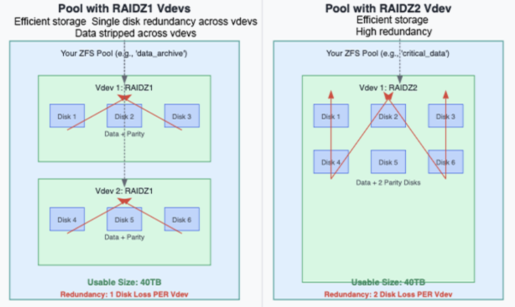 • ZFS stripes data across vdevs, not individual disks, so more vdevs can lead to better performance for workloads with many small files or random I/O.
